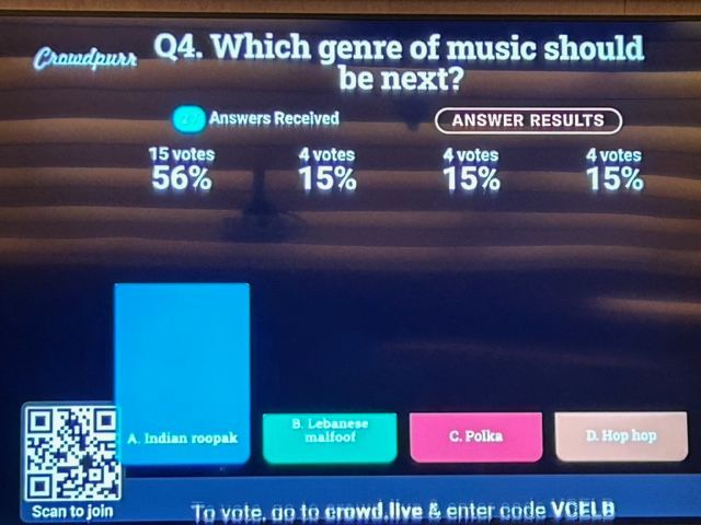 The music components and visual components will be linked and controlled in tandem so that if one aspect is changed it will be reflected in both the visuals and music. Parts of the piece will be controlled by real-time polling of the audience using their phones.